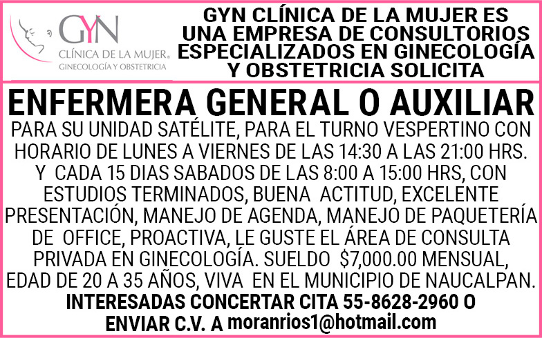GYN CLINICA DE LA MUJER ES UNA EMPRESA DE CONSULTORIOS ESPECIALIZADOS EN GINECOLOGÍA Y OBSTETRICIA SOLICITA ENFERMERA GENERAL O AUXILIAR